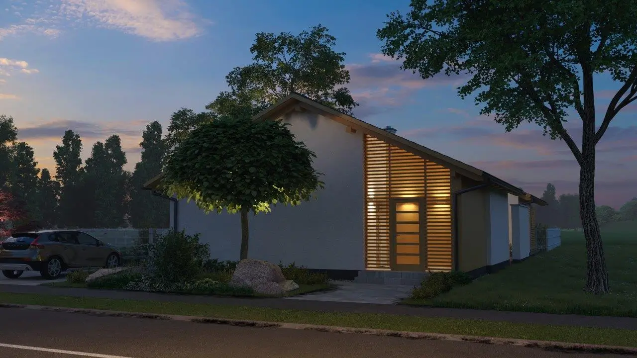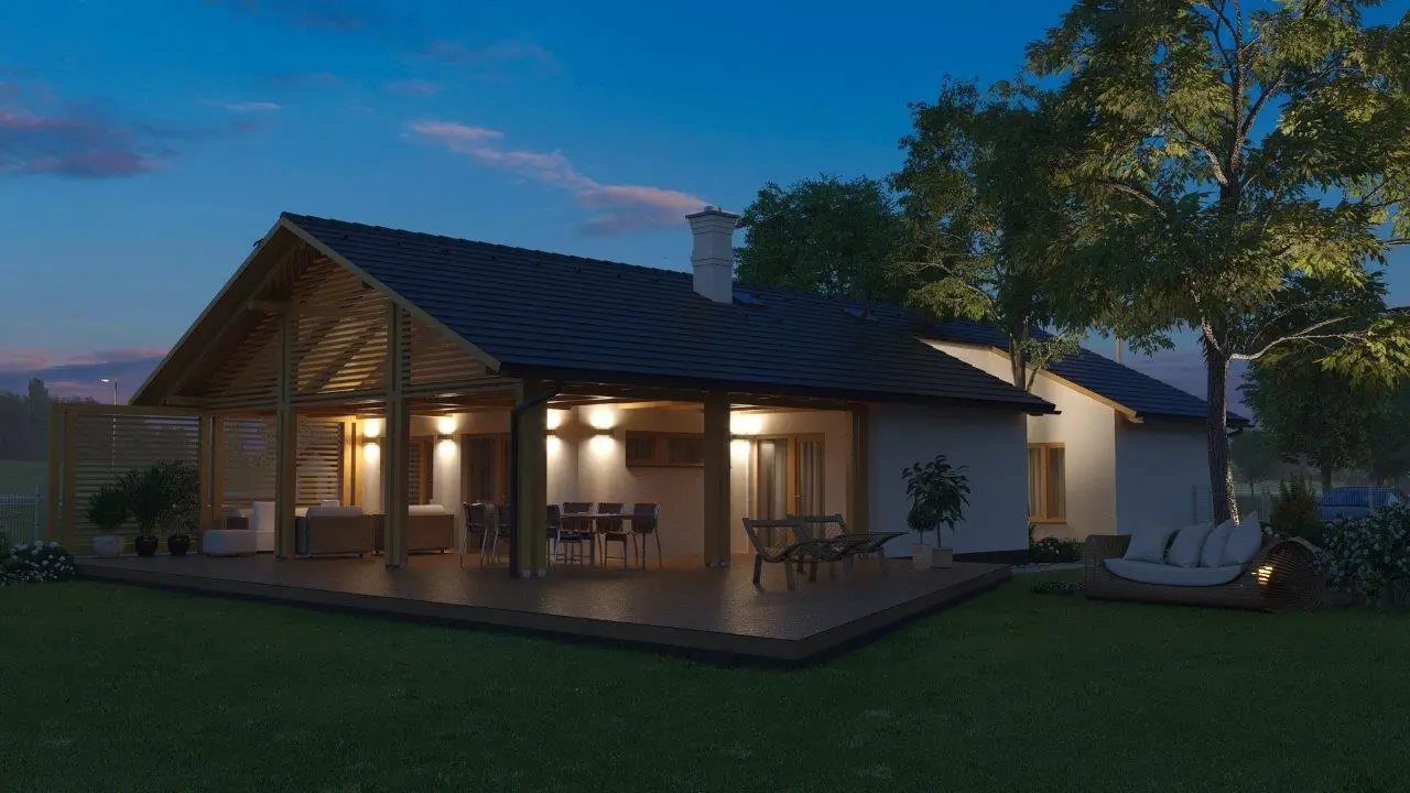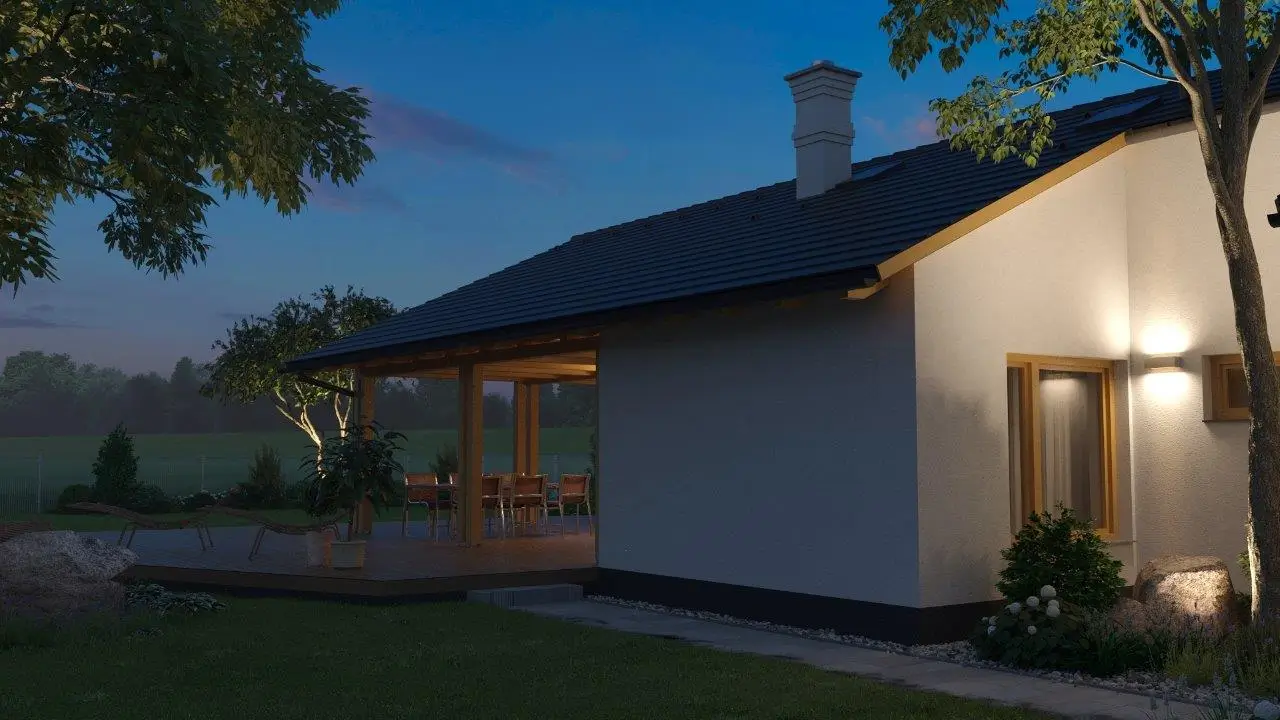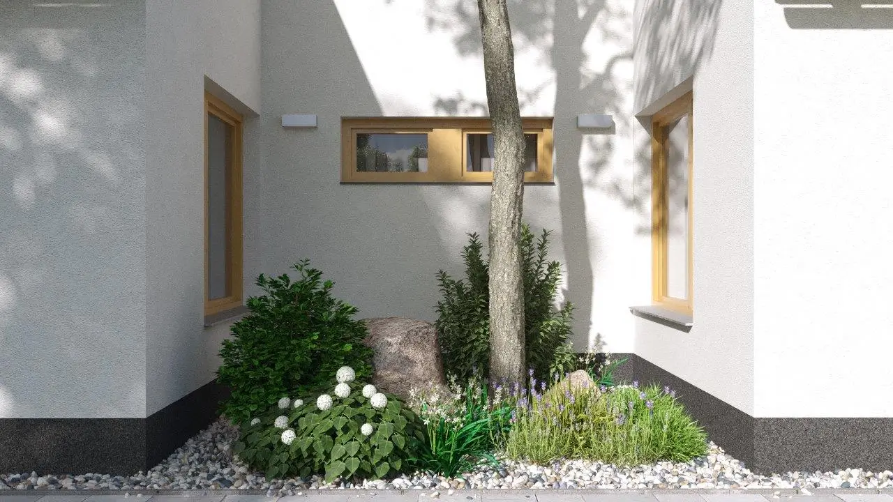A település szélén fekvő telek délnyugati hátsó szomszédja már nem beépíthető, így a nappalit és étkezőt az örök panoráma irányába nyitottuk meg. A beltéri közösségi funkciójú helyiségek meghosszabbításaként került kialakításra a közel ötven négyzetméteres fedett terasz. A Megrendelő számára rendkívül fontos igény volt az élettér kibővítése. A ház az utca front felől elszigeteltséget mutat, amely egyértelműen reflektál az itt elhelyezkedő helyiségek funkciójára. A hálószobák a belső udvarok felé nyílnak, így garantált a privát szféra biztonsága. A négy oldalról falakkal határolt átrium minden napszakban árnyékos, amely maximálisan hozzájárul a ház kellemes klímájához.