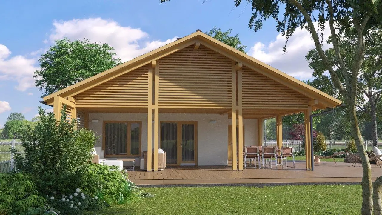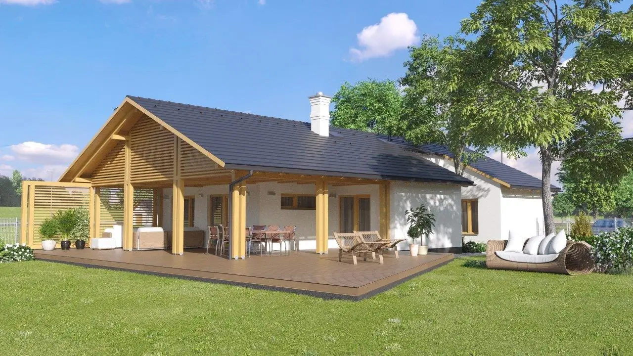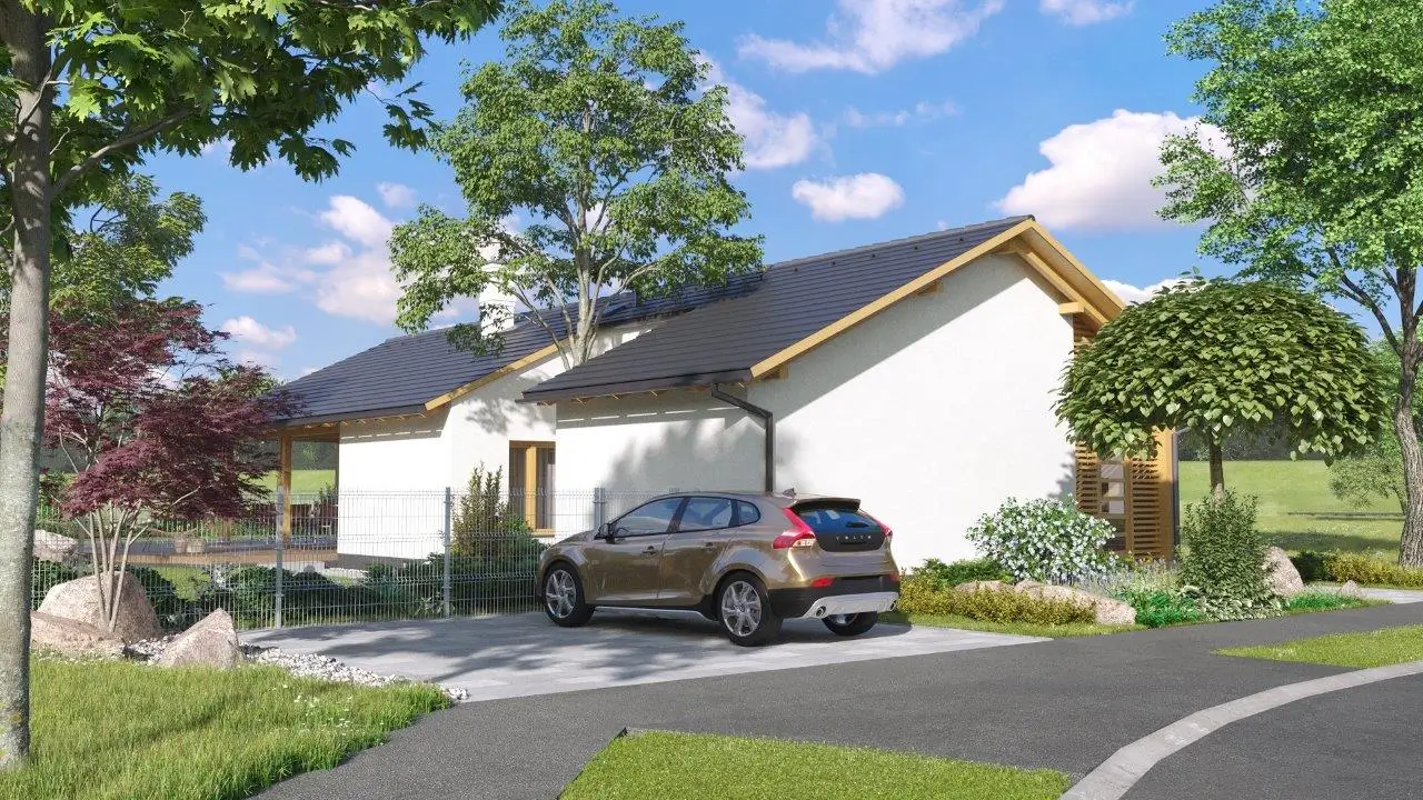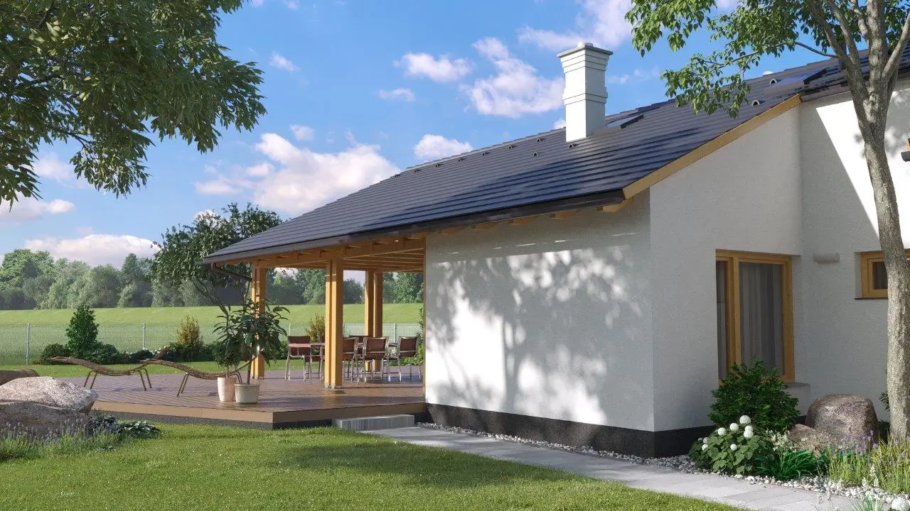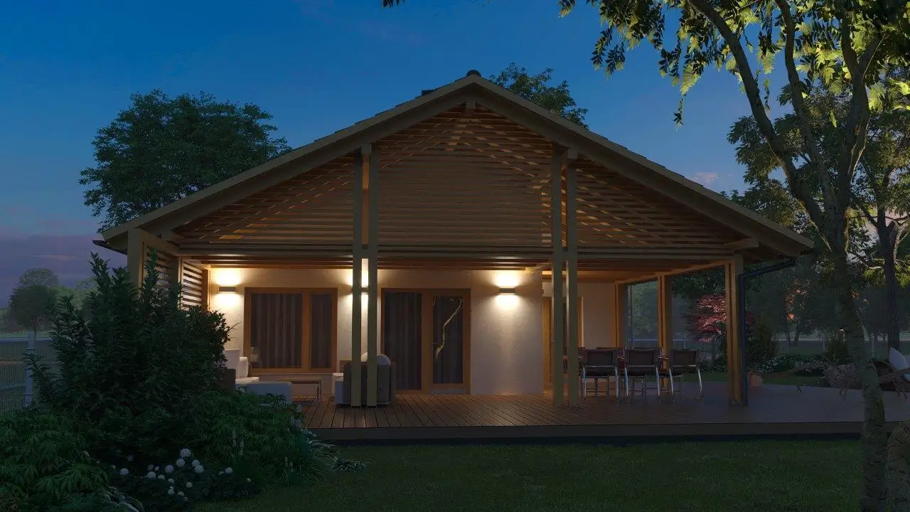 A település szélén fekvő telek délnyugati hátsó szomszédja már nem beépíthető, így a nappalit és étkezőt az örök panoráma irányába nyitottuk meg. A beltéri közösségi funkciójú helyiségek meghosszabbításaként került kialakításra a közel ötven négyzetméteres fedett terasz. A Megrendelő számára rendkívül fontos igény volt az élettér kibővítése. A ház az utca front felől elszigeteltséget mutat, amely egyértelműen reflektál az itt elhelyezkedő helyiségek funkciójára. A hálószobák a belső udvarok felé nyílnak, így garantált a privát szféra biztonsága. A négy oldalról falakkal határolt átrium minden napszakban árnyékos, amely maximálisan hozzájárul a ház kellemes klímájához.