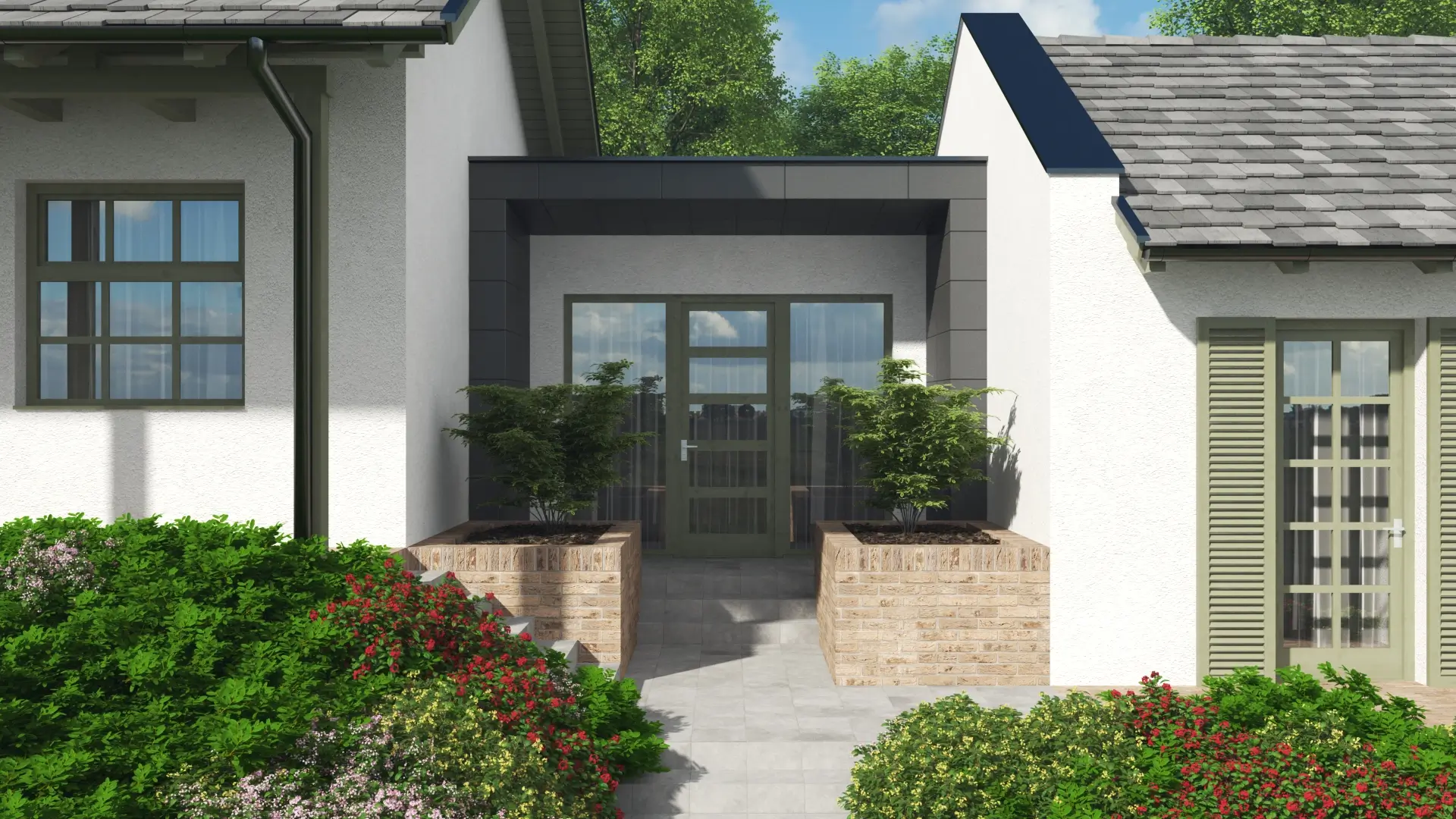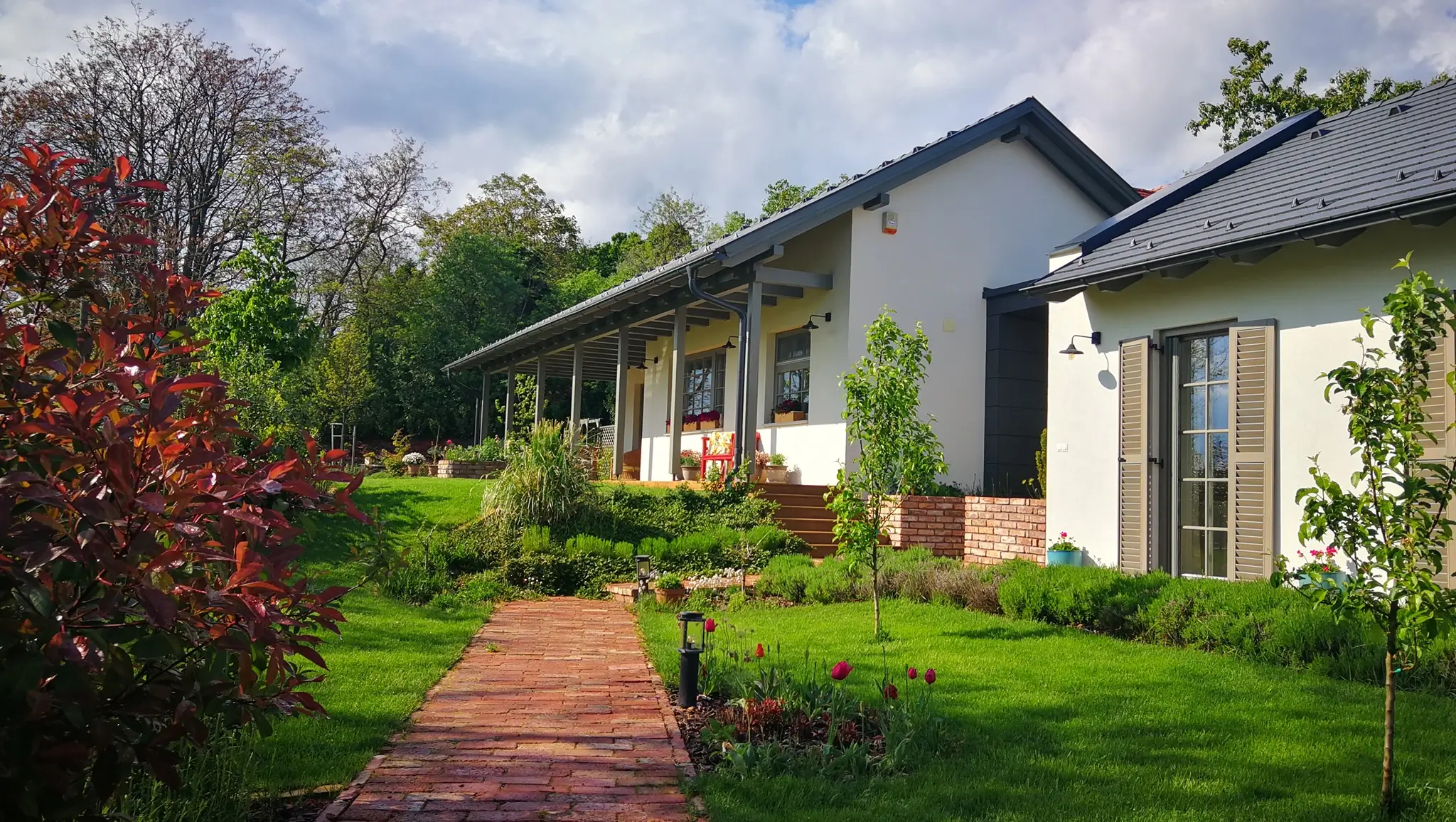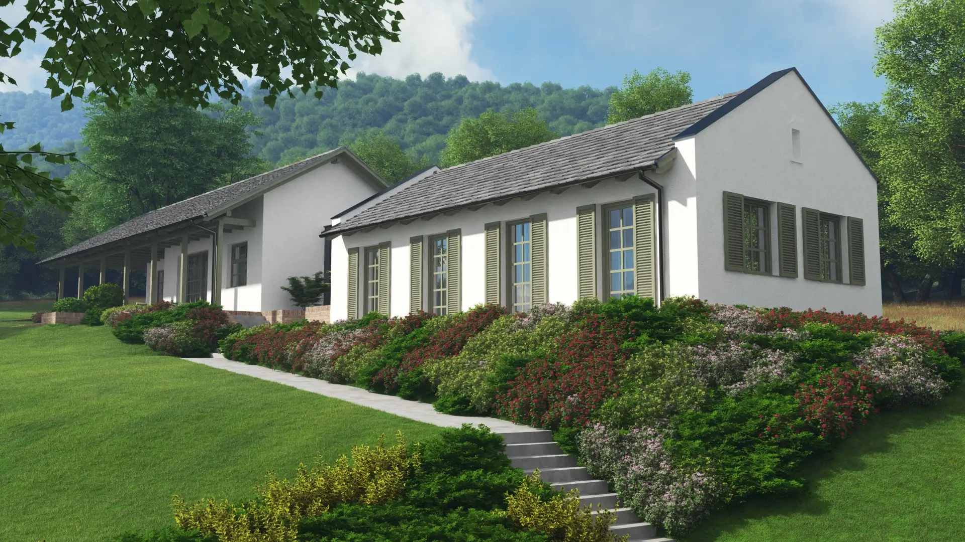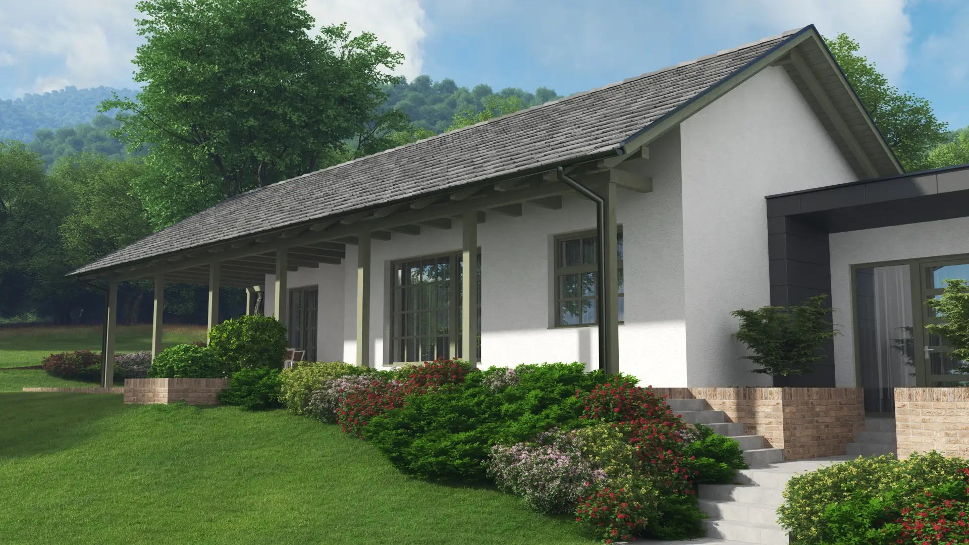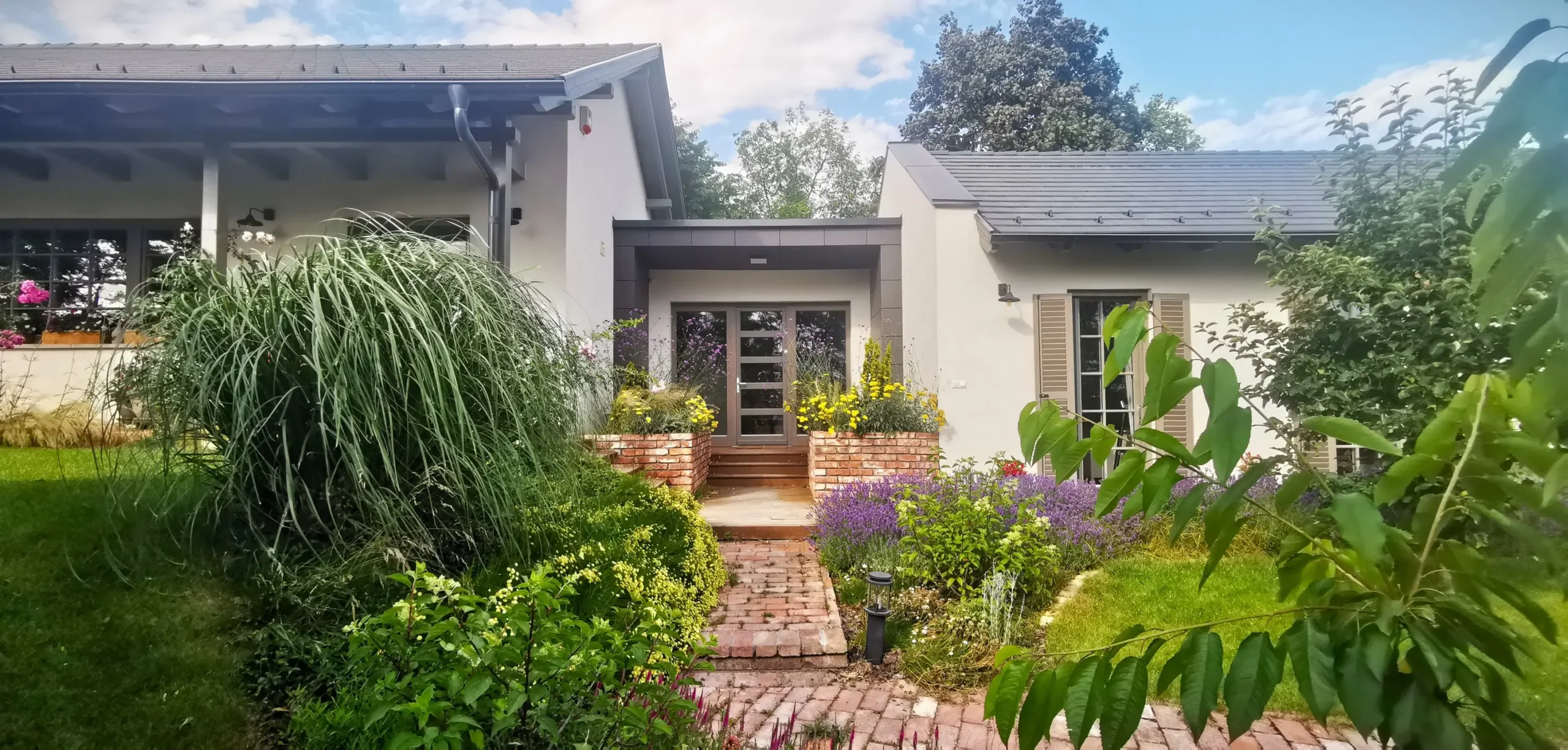 A provance-i stílusban tervezett ház tömege visszafogottan simul bele a domboldalba. A nyílászárók és zsalugáterek színhasználatának köszönhetően a hely szelleme visszaköszön az építészeti elemekben. A tervezési fázisban a Megrendelővel egyetértettünk abban, hogy a házat alkotó két fő funkció – azaz az aktív élettér és a passzív pihenő szekció – erőteljesen különüljön el egymástól. Ezen a vezérfonalon haladva alakult ki a szinte két különálló épületként értelmezhető tömeg, melyet egy, a megérkezésre külön dedikált helyiség fog össze.